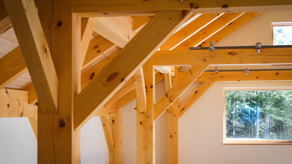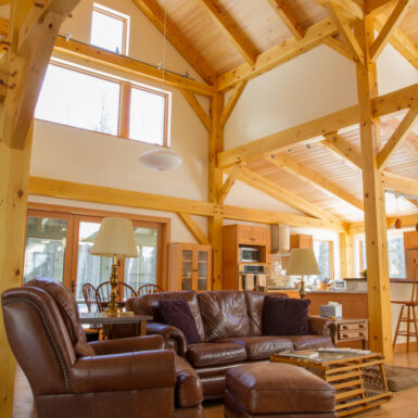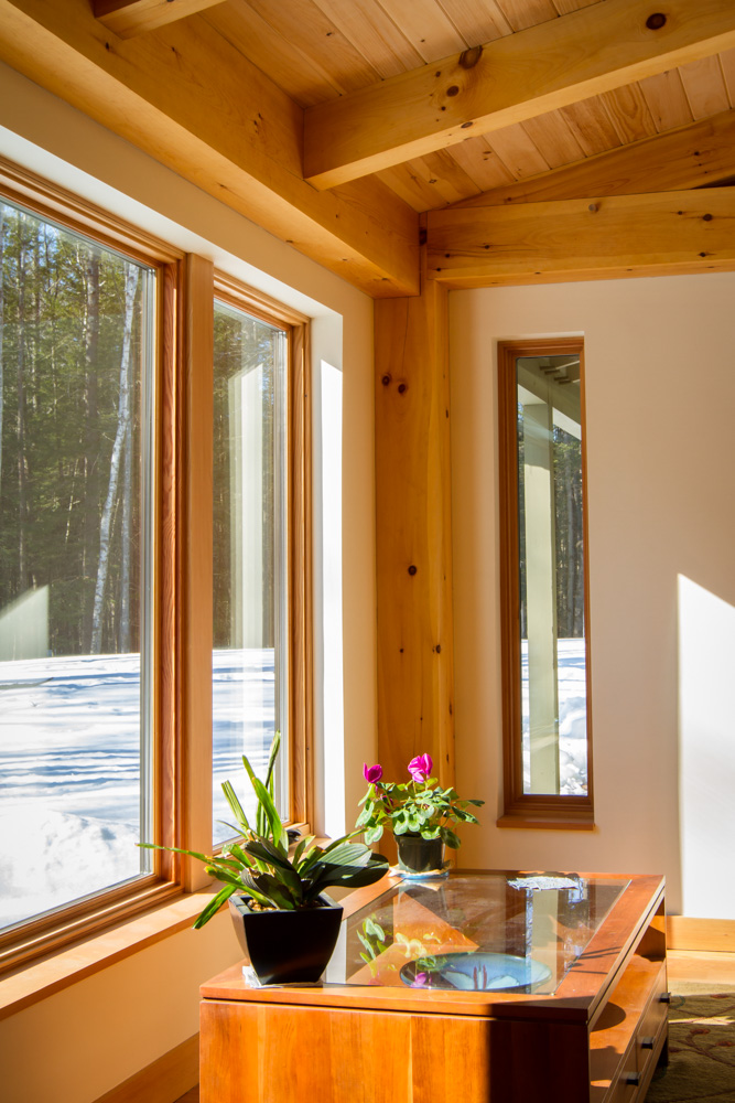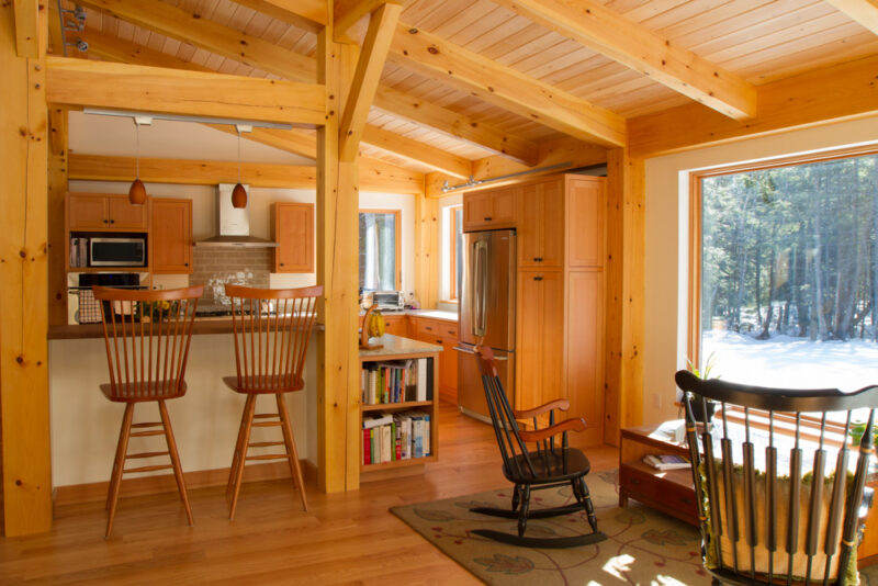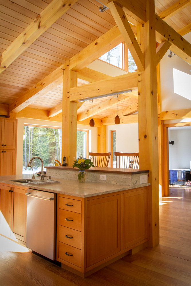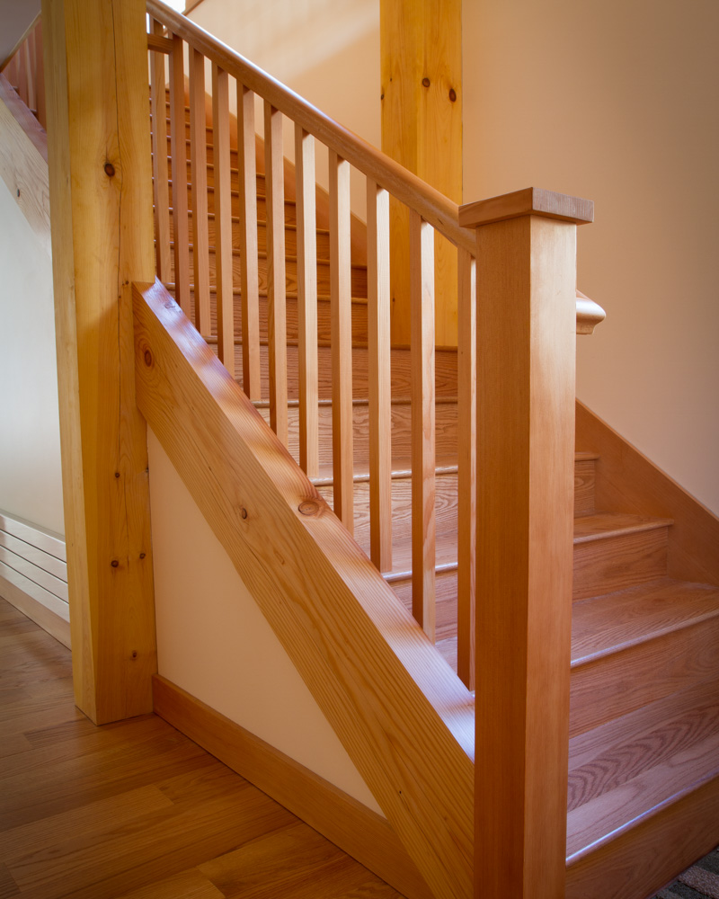 Built in the backyard neighborhood of the Benjamin + Co. headquarters, this architectural gem features many timber features but is a hybrid system including typical stick framing with a SIPs shell. One of our earliest Integrated Design Process projects, where the contractor is involved in the design process at the early stages, we spent many months in remote meetings carefully planning and pricing to prepare for the construction phase. Amy Hinkley, the architect, was one of Ben’s first architecture professors so the design partnership was especially memorable. Featuring triple glazed windows and a super-insulated shell, this house helped kick off our initiatives in the high-performance custom home arena. The completed project was a warm welcome for the clients, a couple retiring to Maine.