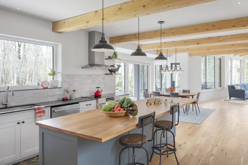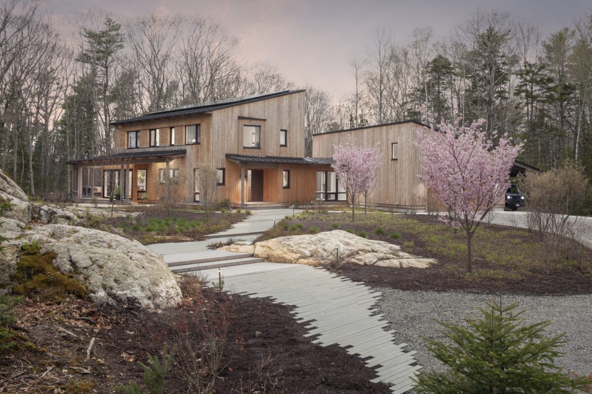 Located just off a tidal inlet in Brunswick, Maine, this beautiful net-zero, Passive House–level residence was brought to life through the visionary work of Kaplan Thompson Architects. The clients—a family of four—envisioned a contemporary home that responds thoughtfully to the site’s dramatic granite outcroppings and the surrounding former New England fields, now gradually returning to hardwood forest. The home features innovative, sustainability-minded details, including ultra-durable thermally modified spruce cladding and decking, Schüco triple-pane European windows, and an all-wood floor slab that reduces the project’s embodied carbon.