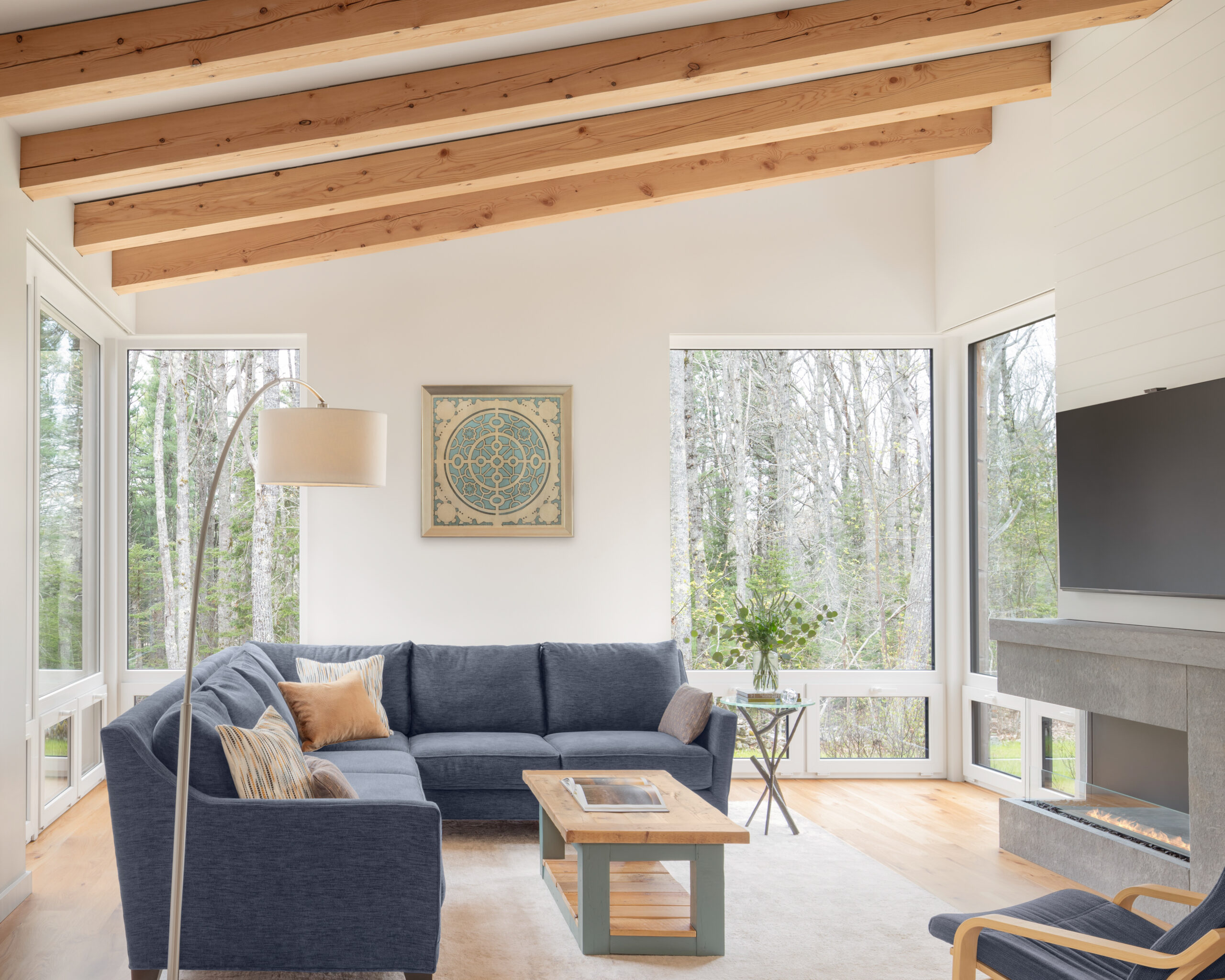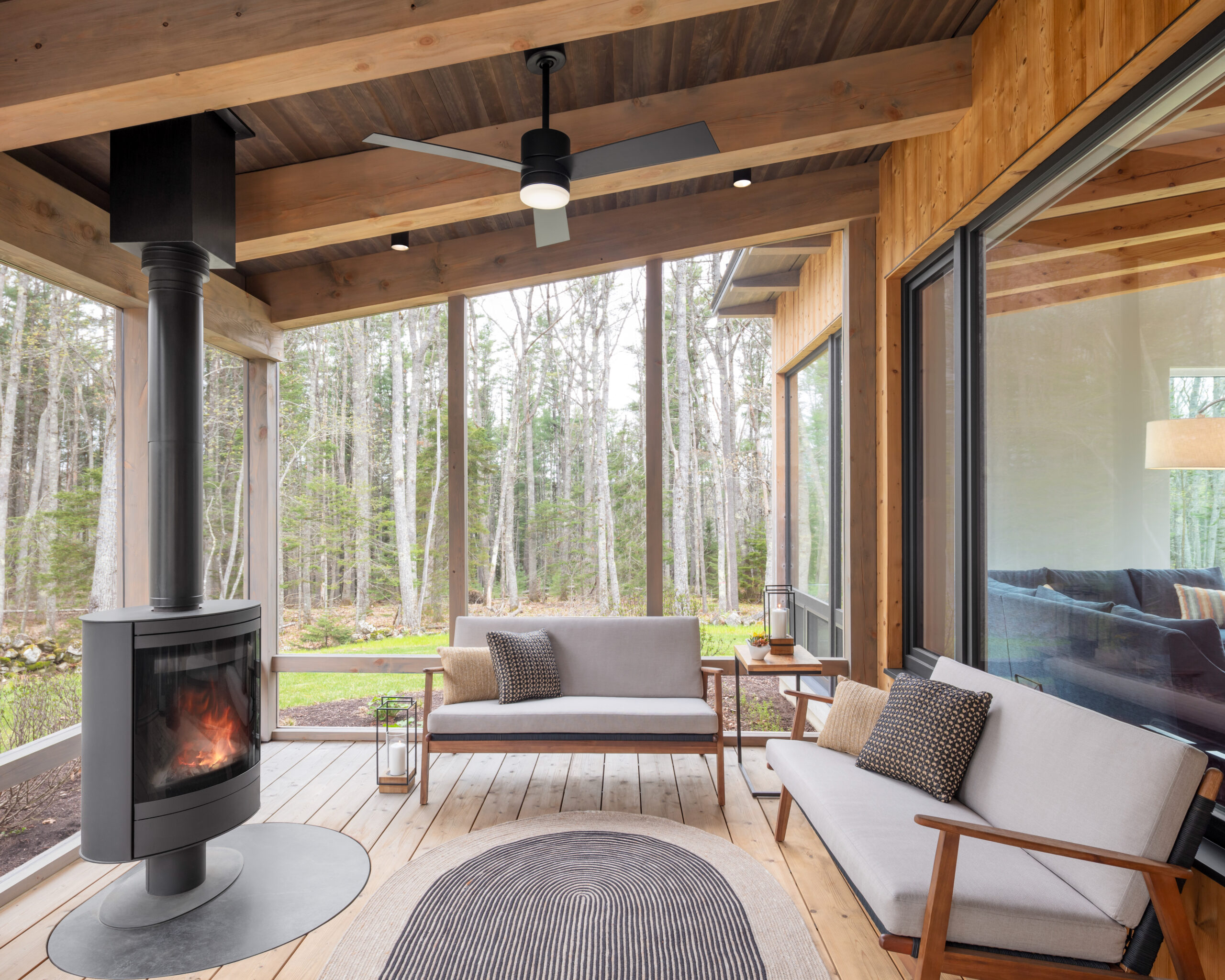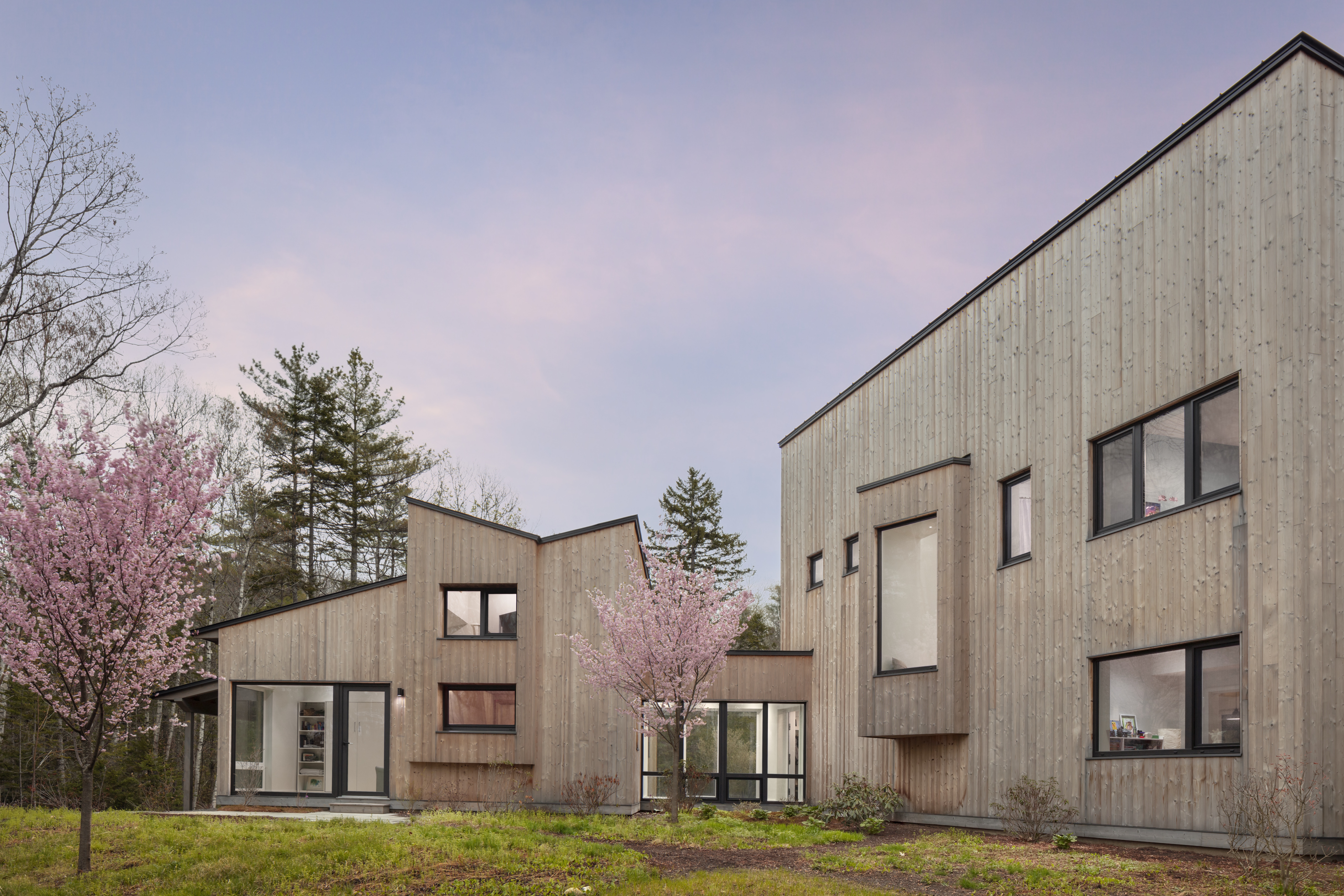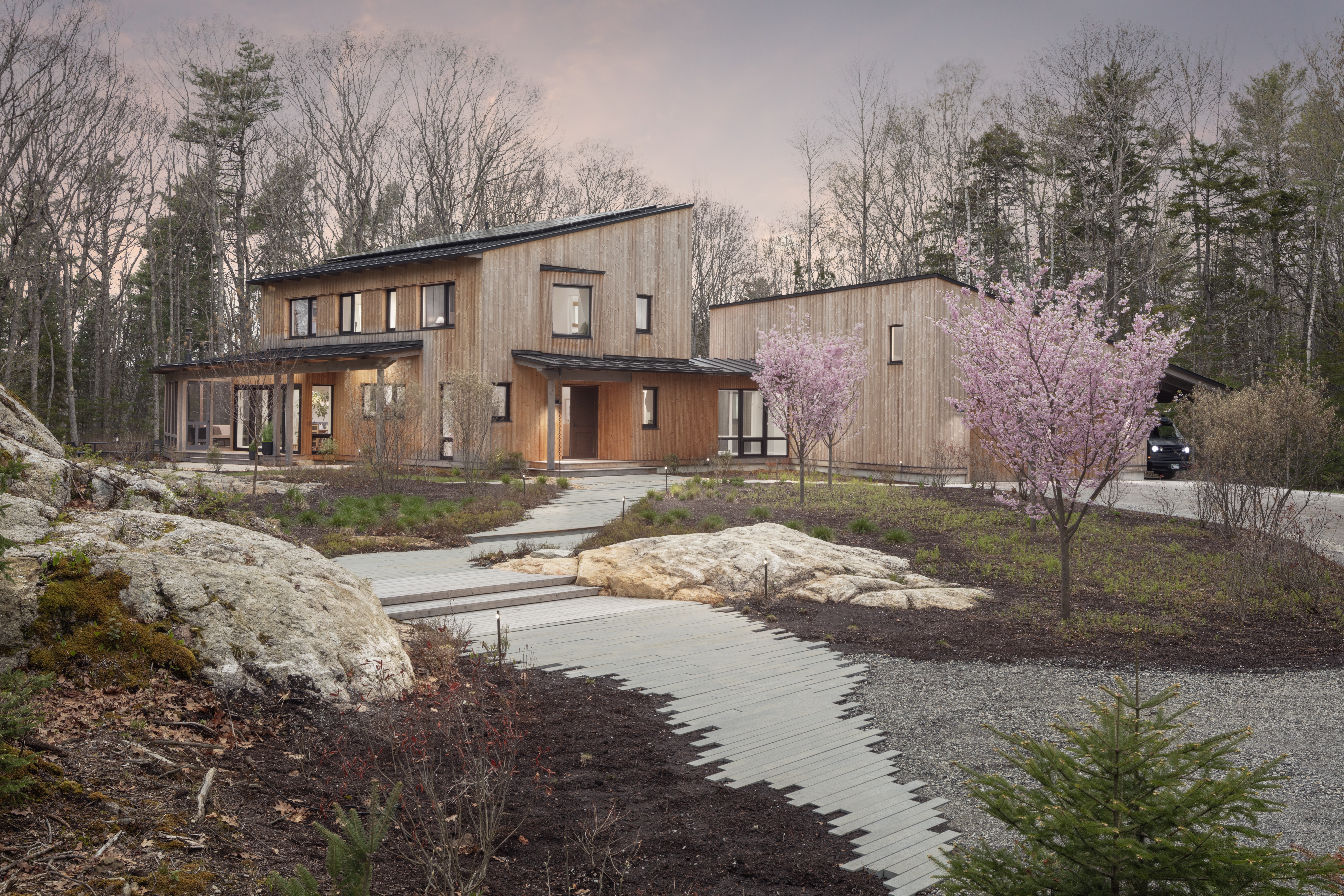 Located just off a tidal inlet in Brunswick, Maine, this beautiful net-zero, Passive House–level residence was brought to life through the visionary work of Kaplan Thompson Architects. The clients—a family of four—envisioned a contemporary home that responds thoughtfully to the site’s dramatic granite outcroppings and the surrounding former New England fields, now gradually returning to hardwood forest. The home features innovative, sustainability-minded details, including ultra-durable thermally modified spruce cladding and decking, Schüco triple-pane European windows, and an all-wood floor slab that reduces the project’s embodied carbon.